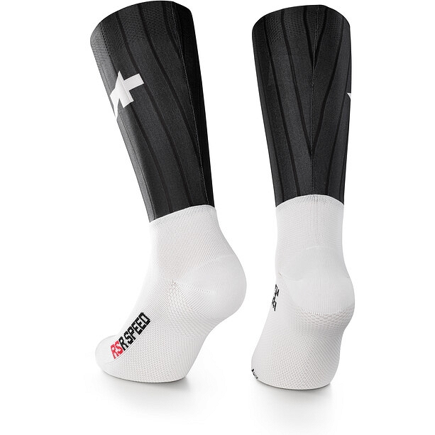 Assos RS Speed Socks to skarpetki, które powstały przy udziale zawodników z Pro Touru i mają za zadanie zapewnić maksymalną aerodynamikę bez konieczności noszenia owiewek na buty. Dół wykonano podobnie jak tradycyjne skarpetki kolarskie z linii RS z oddychającego, cienkiego i lekko kompresyjnego materiału. Najważniejsza część znajduje się nad butem - mankiet skarpetki to aerodynamiczna, ściśle dopasowana konstrukcja wykonana z kompresyjnej tkaniny, która minimalizuje opór powietrza. Wysokość skarpety to około 18cm i jest ona zgodna z zasadami UCI.