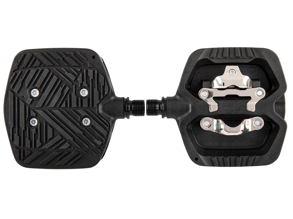 Z jednej strony mechanizm zatrzaskowy kompatybilny z SPD, z drugiej płaski pedał z platformą z elastomeru dla bezpiecznej jazdy w każdych warunkach.