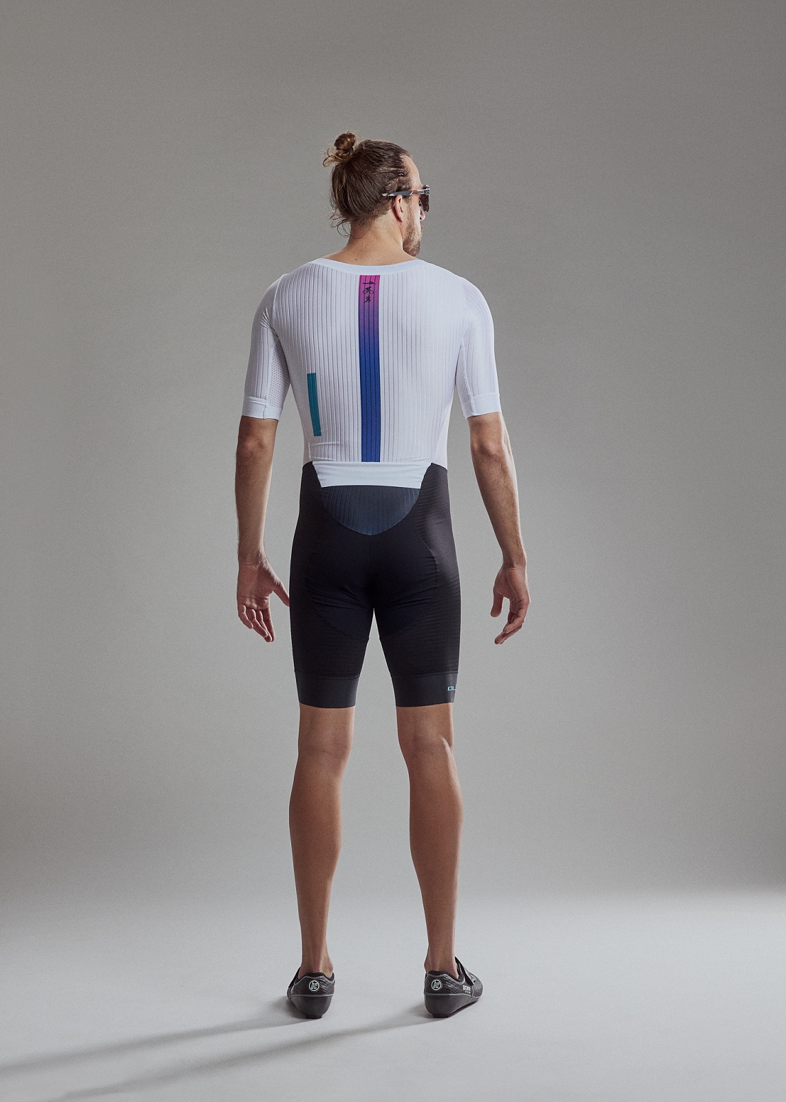 Ten strój jest mocno dopasowany do ciała. Zastosowanie kompresyjnych materiałów w kluczowych miejscach, podtrzymuje mięśnie, aby jeszcze lepiej wykorzystać ich potencjał i minimalizować marszczenie stroju, które generuje niepotrzebne opory. Mocno wycięty kołnierzyk nie podchodzi pod szyję i idealnie układa się w pozycji na lemondce.