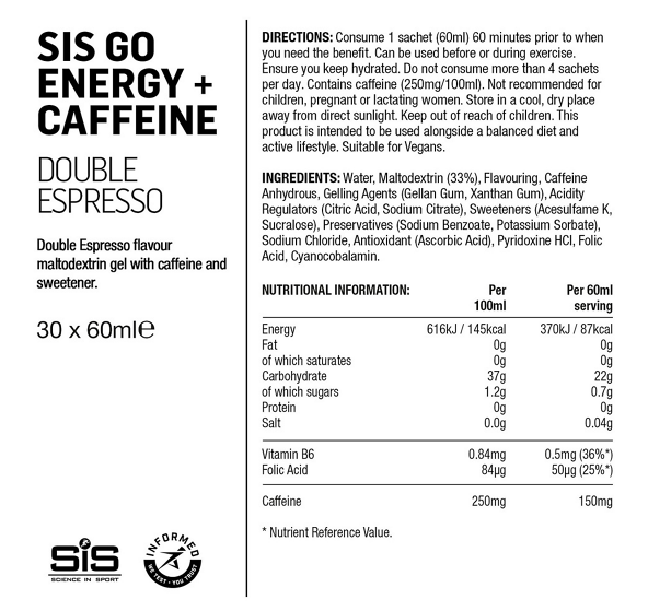 Każde opakowanie SiS Go Energy zawiera 22g węglowodanów. Taka porcja dostarcza energii na 20 do 30 minut ćwiczeń. Żel jest łatwy i szybki w użyciu, a co najważniejsze, nie podrażnia przełyku, ponieważ jest łagodny w smaku i nie trzeba go popijać wodą. I to właśnie dlatego jest wyjątkowy i jedyny w swoim rodzaju.